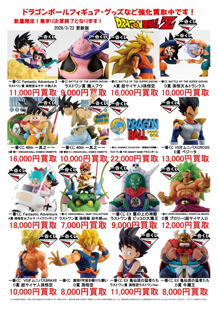 ドラゴンボールフィギュア買取告知更新しました! ※2026/3/22現在の価格となります。 在庫状況などによってお値段が変動いたします。予めご了承ください。 **************** こちら↓もぜひチェックしてみ…