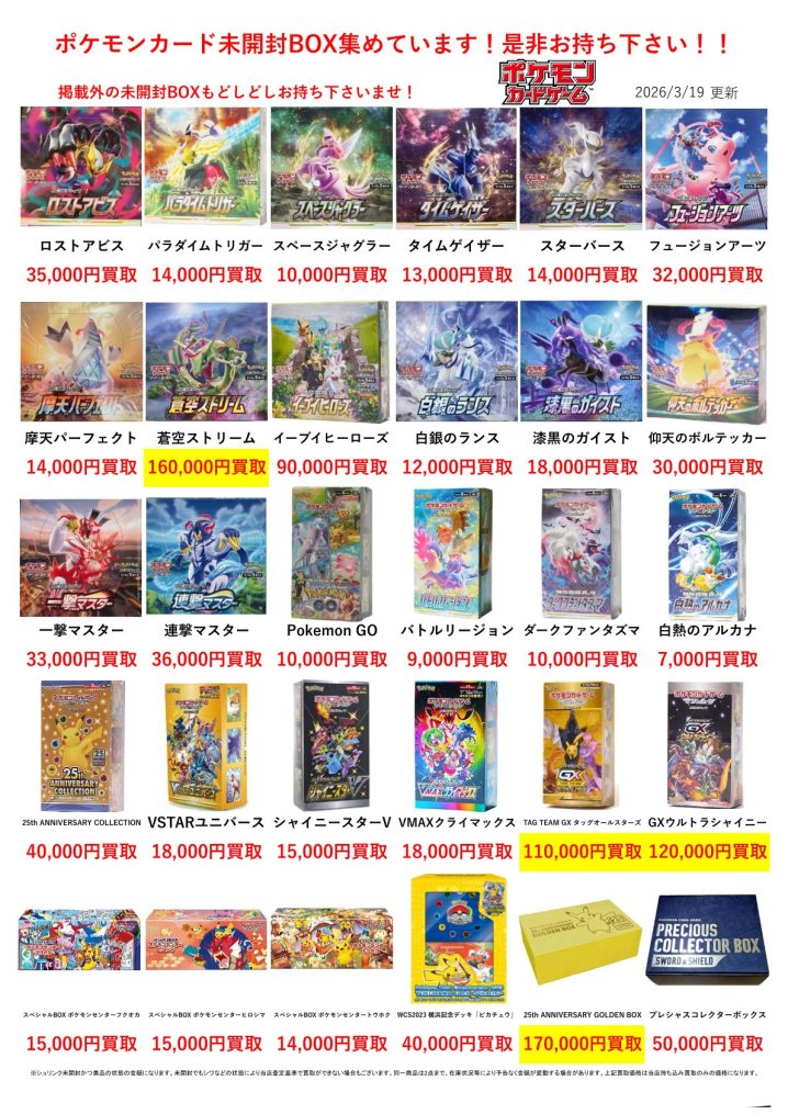 ポケモンカード買取告知更新しました! ※2026/3/19現在の価格となります。 在庫状況などによってお値段が変動いたします。予めご了承ください。 **************** こちら↓もぜひチェックしてみてください…