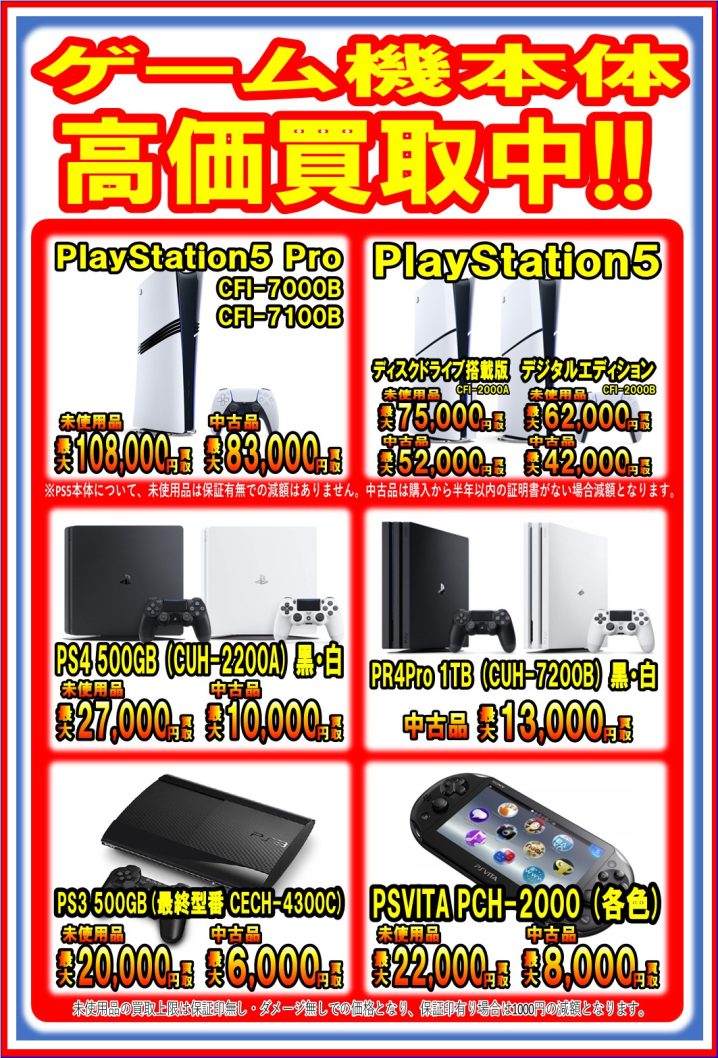 PS5本体、PSポータルの値上げに伴い、未使用品の買取金額を上げました! ※2026/3/29現在の価格となります。 在庫状況などによってお値段が変動いたします。予めご了承ください。 **************** こ…