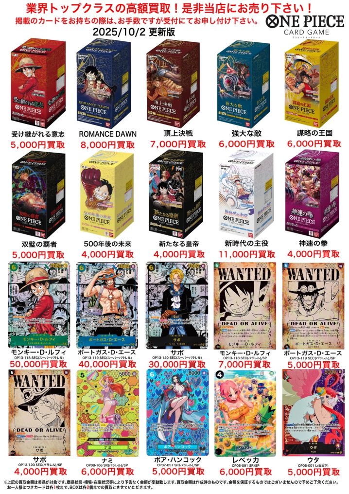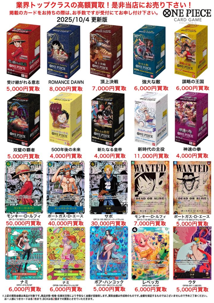 ワンピースカード買取告知更新しました! ※2025/10/4現在の価格となります。 在庫状況などによってお値段が変動いたします。予めご了承ください。 **************** こちら↓もぜひチェックしてみてくださ…