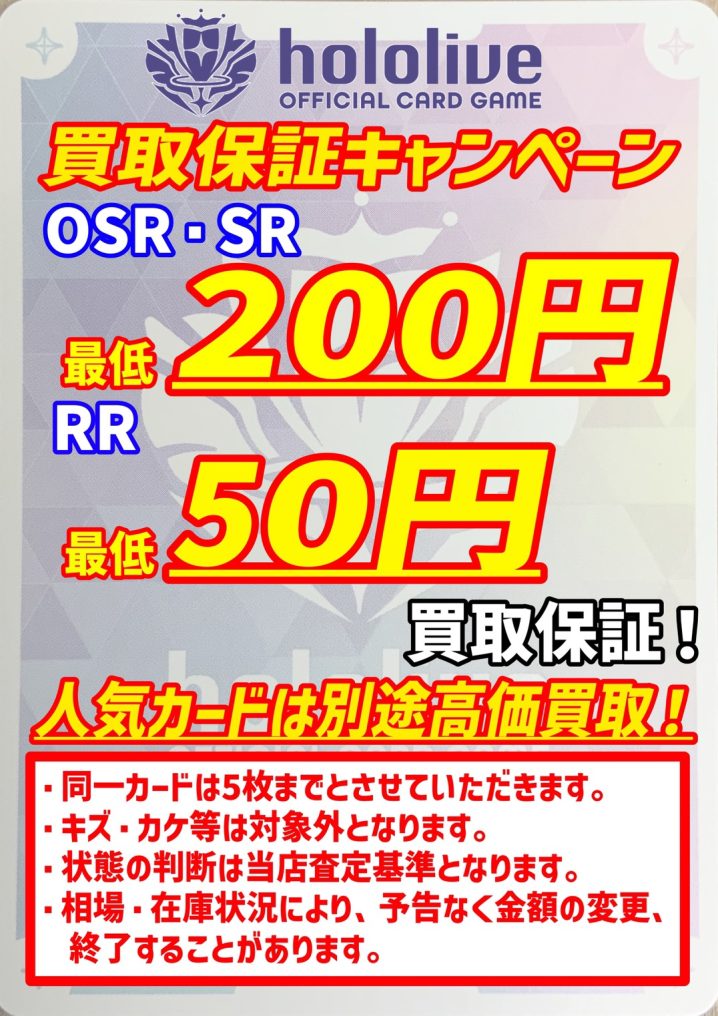 ★買取情報★ ホロライブOCGのカード買取大募集! SR・RRが足りていません! 現在期間限定で買取保証キャンペーンを実施中! 枚数が集まり次第終了となっていますので、この機会にぜひ当店をご利用ください! ※2025/1…