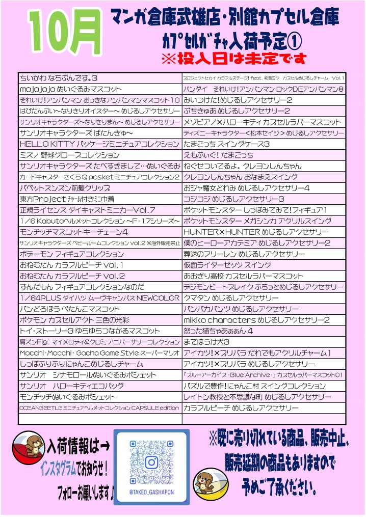 10月のカプセルガチャ入荷予定のお知らせです! 入荷予定日、投入日は未定です。 ※既に売り切れている商品や、販売中止・延期になる商品もあります。お電話でのお問い合わせにもお答えできない可能性もあります。予めご了承ください…