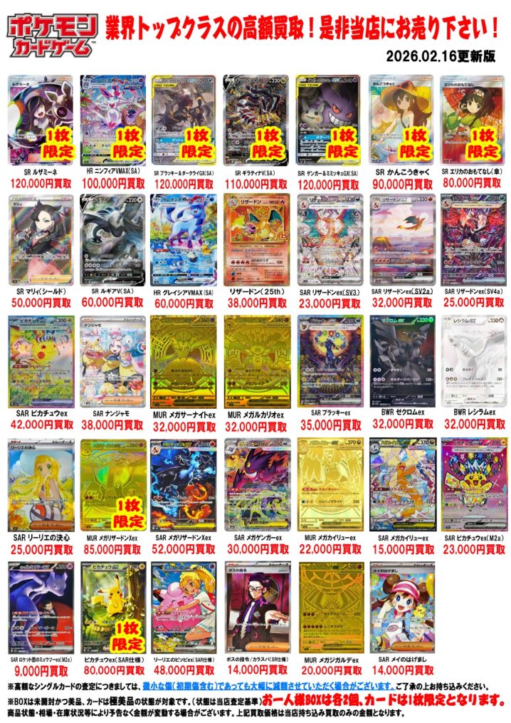 ポケモンカード買取告知更新しました! ※2026/2/16現在の価格となります。 在庫状況などによってお値段が変動いたします。予めご了承ください。 **************** こちら↓もぜひチェックしてみてください…