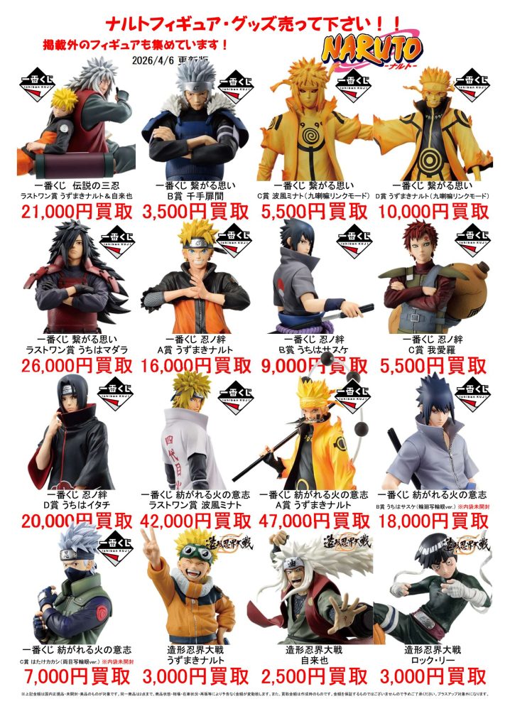 ★ナルトフィギュア買取告知更新しました!★ ※2026/4/6現在の価格となります。 在庫状況などによってお値段が変動いたします。予めご了承ください。 **************** こちら↓もぜひチェックしてみてくだ…