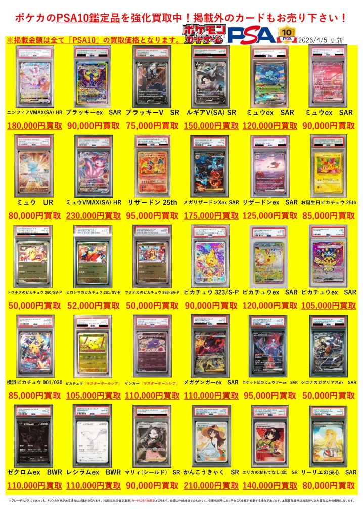 ★ポケカ PSA10買取価格更新しました!★ ※2026/4/5現在の価格となります。 在庫状況などによってお値段が変動いたします。予めご了承ください。 **************** こちら↓もぜひチェックしてみてく…
