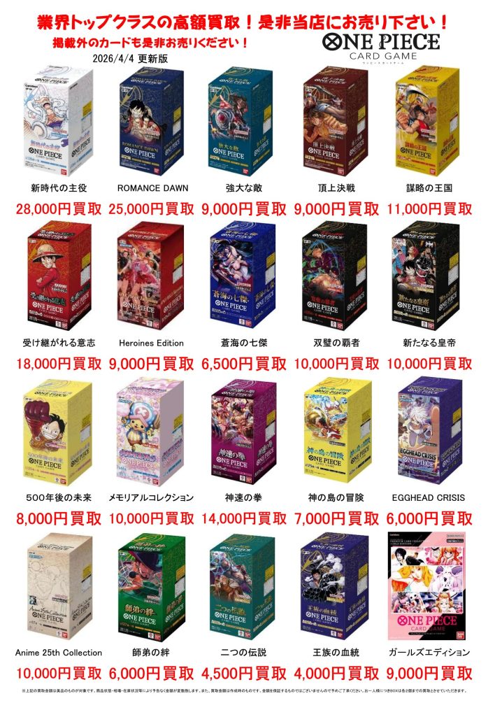 ワンピースカード 買取情報📢 ※2026/4/4現在の価格となります。 在庫状況などによってお値段が変動いたします。予めご了承ください。 **************** こちら↓もぜひチェックしてみてく…