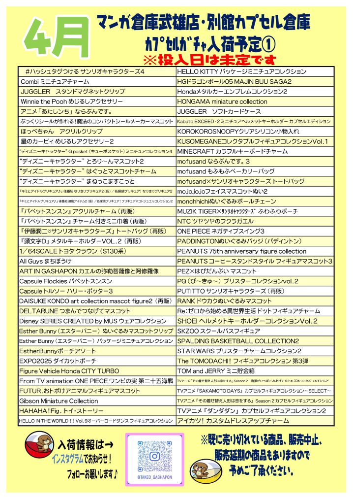 4月のカプセルガチャ入荷予定のお知らせです! 今月も人気シリーズや注目アイテムが続々登場予定となっています。 入荷予定日、投入日は未定となっています。 ※既に売り切れている商品や、回数制限を儲けさせていただく商品、販売中…