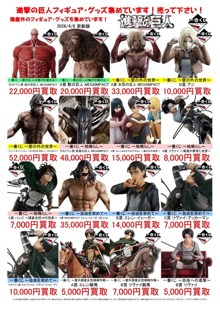 ★進撃の巨人フィギュア買取告知更新しました!★ ※2026/4/6現在の価格となります。 在庫状況などによってお値段が変動いたします。予めご了承ください。 **************** こちら↓もぜひチェックしてみて…