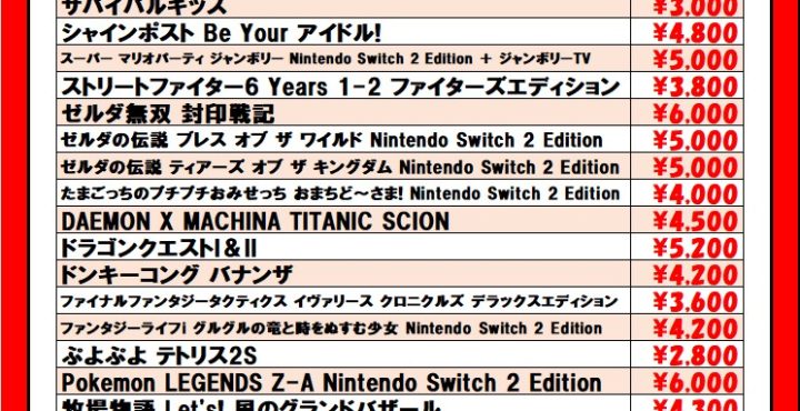 Switch2、Switch、PS5、PS4ソフト買取情報更新しました! ※2025/10/26現在の価格となります。 在庫状況などによってお値段が変動いたします。予めご了承ください。 **************** …