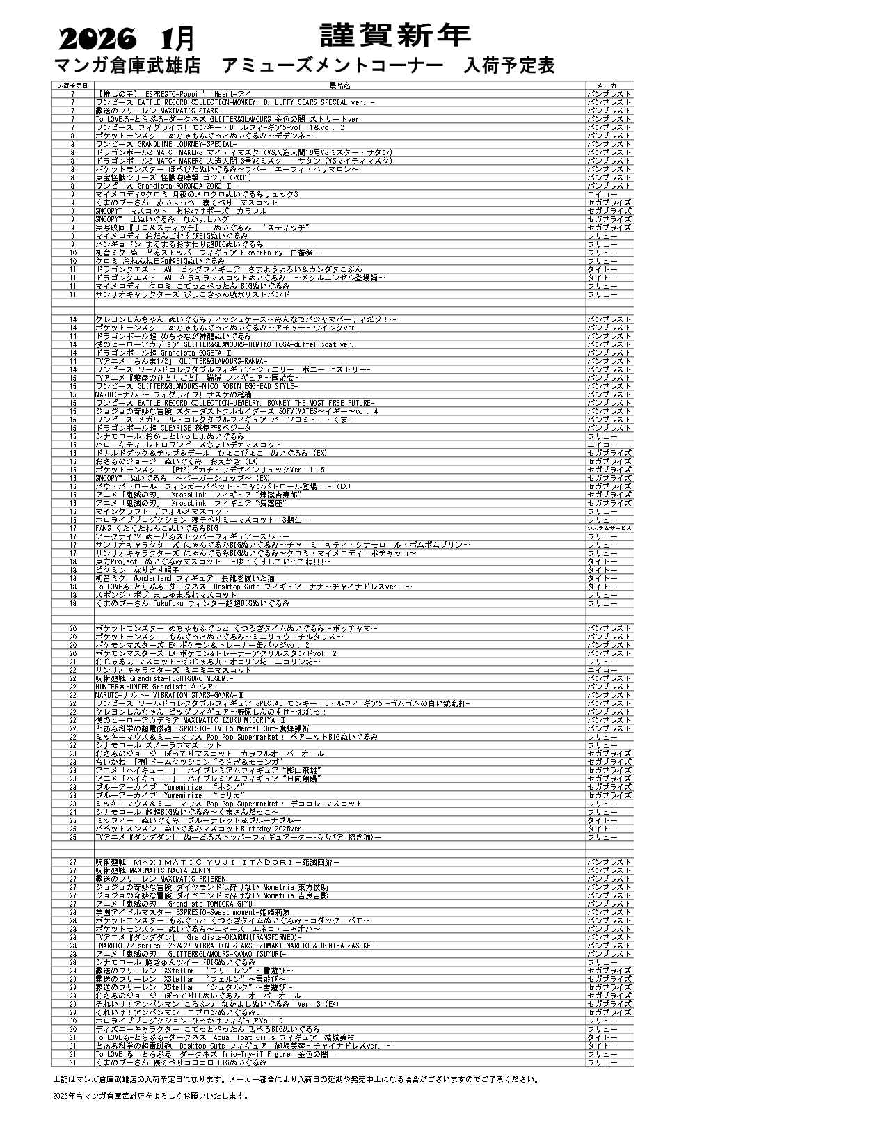 武雄店2026年1月 のアミューズ景品入荷予定表です!